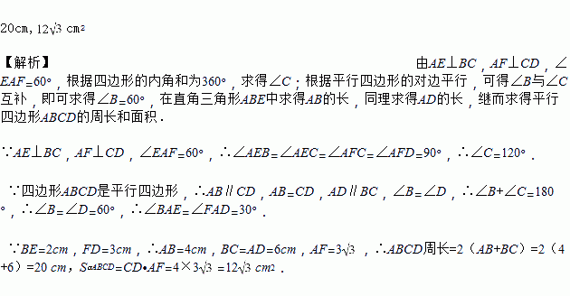 如图,在平行四边形ABCD中,AE⊥BC于E,AF⊥CD于F,且∠EAF=60°,BE=2cm,DF=3cm,试求平行四边形ABCD的周长及面积.