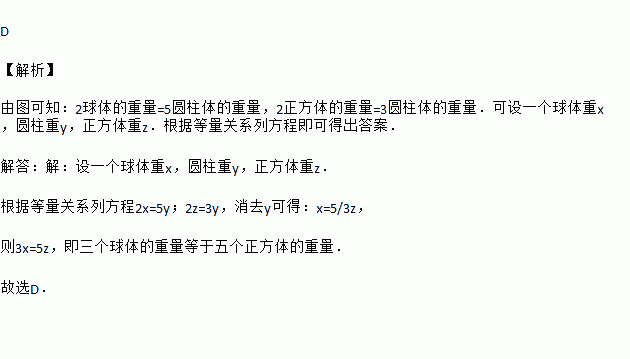 中央电视台2套“开心辞典”栏目中,一期的题目如图所示,两个天平都平衡,则三个球体的重量等于( )个正方体的重量.