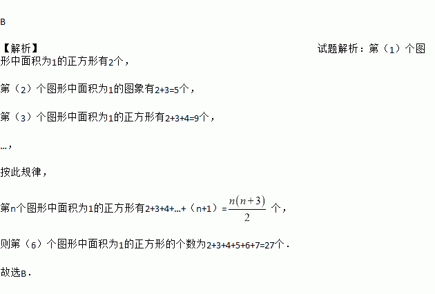 如图,下列图形都是由面积为1的正方形按一定的规律组成,其中,第(1)个图形中面积为1的正方形有2个,第(2)个图形中面积为1的正方形有5个,第(3)个图形中面积为1的正方形有9个,…,按此规律.则第(6)个图形中面积为1的正方形的个数为( )