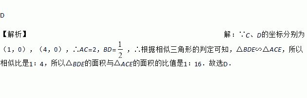 的图象上的两点.AC、BD都垂直于x轴,垂足分别为C、D.AB的延长线交x轴于点E.若C、D的坐标分别为(1,0)、(4,0),则ΔBDE的面积与ΔACE的面积的比值是 ( )