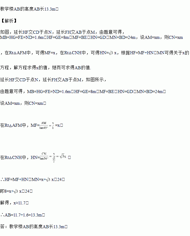 如图,校园内有两幢高度相同的教学楼AB,CD,大楼的底部B,D在同一平面上,两幢楼之间的距离BD长为24米,小明在点E(B,E,D在一条直线上)处测得教学楼AB顶部的仰角为45°,然后沿EB方向前进8米到达点G处,测得教学楼CD顶部的仰角为30°.已知小明的两个观测点F,H距离地面的高度均为1.6米,求教学楼AB的高度AB长.(精确到0.1米)参考值:
