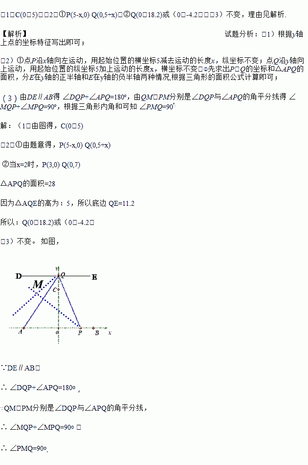 (3)在点P、Q运动过程中,过点Q作x轴的平行线DE,∠DQP与∠APQ的角平分线交于点M,则∠PMQ的大小会随点P、Q的运动而变化吗?如果不变化,请求出∠PMQ的度数;若发生变化,请说明理由。