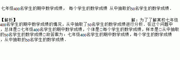 七年级400名学生的期中数学成绩, 每个学生的数学成绩 从中抽取的50名学生的数学成绩. 【解析】【解析】 为了了解某校七年级400名学生的期中数学成绩的情况,从中抽取了50名学生的数学成绩进行分析.在这个问题中,总体是:七年级400名学生的期中数学成绩,个体是:每个学生的数学成绩,样本是:从中抽取的50名学生的数学成绩.故答案为:七年级400名学生的期中数学成绩,每个学生的数学成绩,从中...