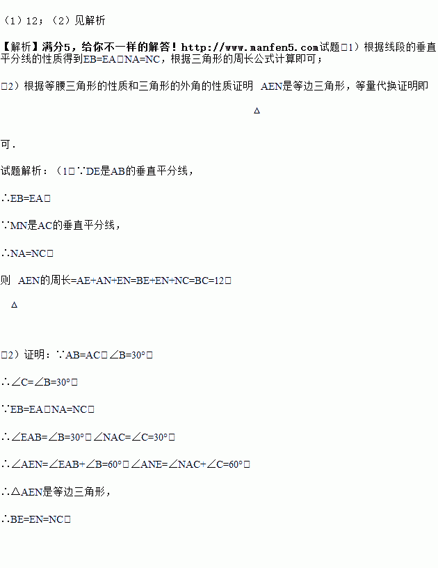 在△ABC中,AB=AC,BC=12,∠B=30°,AB的垂直平分线DE交BC边于点E,AC的垂直平分线MN交BC于点N.