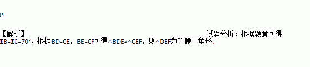 如图,在△ABC中,AB=AC,BD=CF,BE=CD,若∠A=40°,则∠EDF的度数为( )