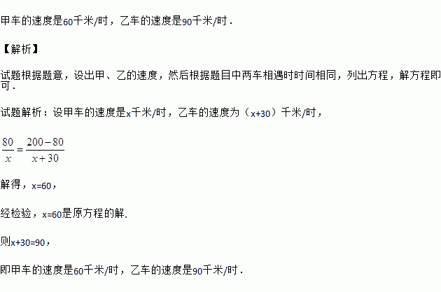 A、B两地相距200千米,甲车从A地出发匀速开往B地,乙车同时从B地出发匀速开往A地,两车相遇时距A地80千米.已知乙车每小时比甲车多行驶30千米,求甲、乙两车的速度.