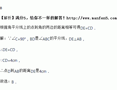 如图,Rt△ABC中,∠C=90°,∠ABC的平分线BD交AC于D,若CD=4cm,则点D到AB的距离DE是( )