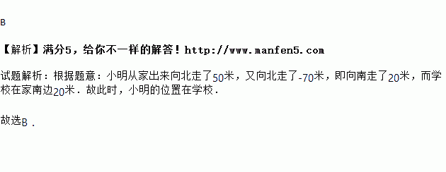 校、家、书店依次坐落在一条南北走向的大街上,学校在家的南边20米,书店在家北边100米,张明同学从家里出发,向北走了50米,接着又向南走了70米,此时张明的位置在( )
