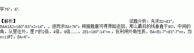 如图,已知∠AOB=7°,一条光线从点A出发后射向OB边.若光线与OB边垂直,则光线沿原路返回到点A,此时∠A=90°-7°=83°.