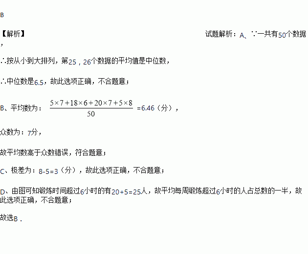 如图,是根据九年级某班50名同学一周的锻炼情况绘制的条形统计图,下面关于该班50名同学一周锻炼时间的说法错误的是( )