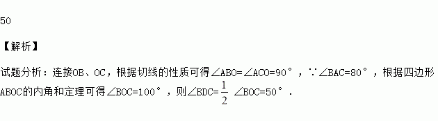 如图,AB、AC是⊙O的两条切线,切点分别为B、C,D是优弧上的一点,已知∠BAC=,那么∠BDC= 度.