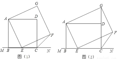 如图(1),已知正方形ABCD在直线MN的上方,BC在直线MN上,E是BC上一点,以AE为边在直线MN的上方作正方形AEFG.