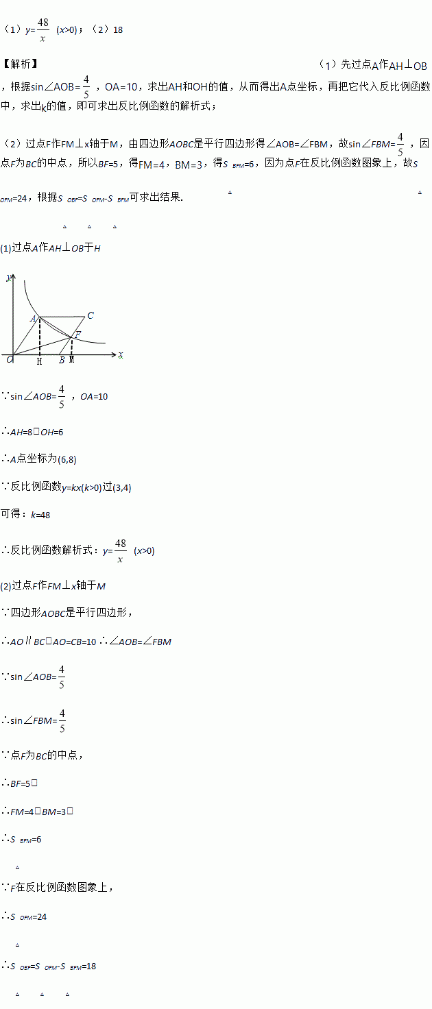 如图,O为坐标原点,点B在x轴的正半轴上,四边形OACB是平行四边形,OA =10,sin∠AOB =