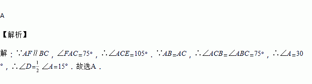 如图,在△ABC中,AB=AC,∠A=30°,E为BC延长线上一点,∠ABC与∠ACE的平分线相交于点D,则∠D的度数为( )