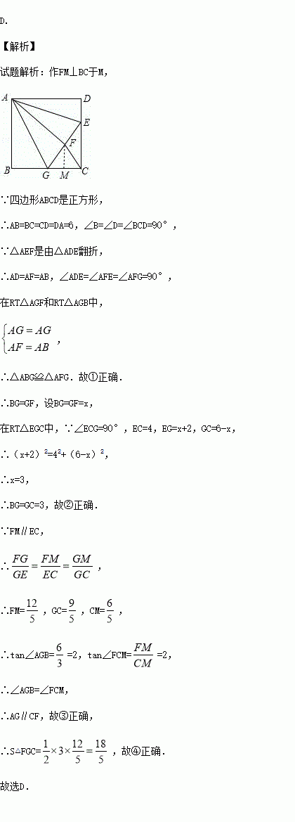 如图,正方形ABCD中,AB=6,点E在边CD上,且CD=3DE,将△ADE沿AE对折至△AFE,延长EF交边BC于点G,连接AG、CF,下列结论: