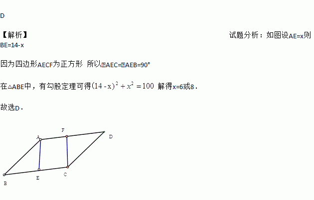 D 【解析】试题分析:如图设AE=x则BE=14-x 因为四边形AECF为正方形 所以∠AEC=∠AEB=90° 在△ABE中,有勾股定理可得解得x=6或8. 故选D.
