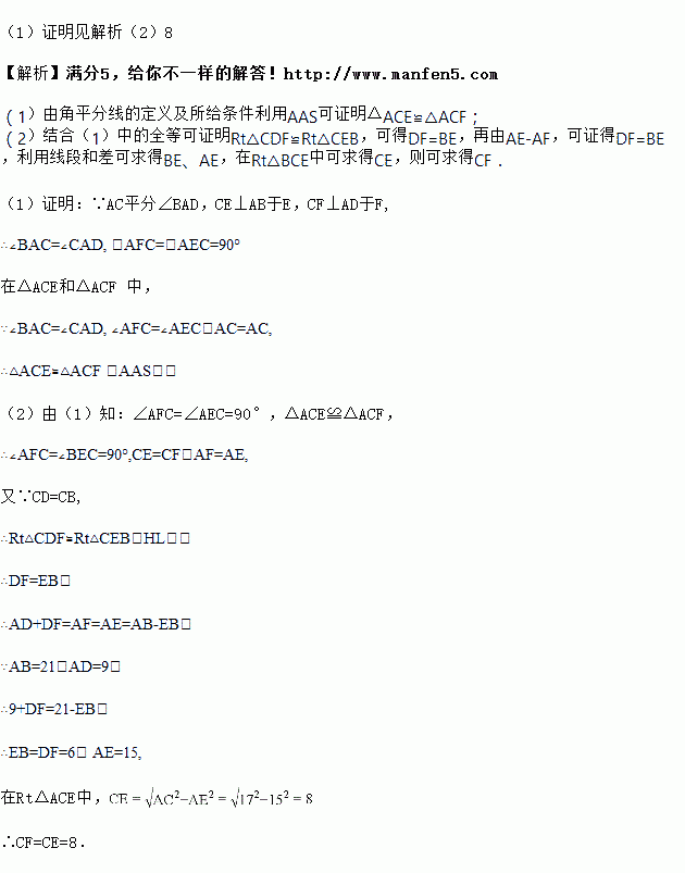 (2)若AB=21,AD=9,AC=17,求CF的长.