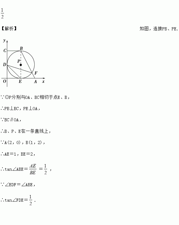 如图,在直角坐标系中,四边形OABC是直角梯形,BC∥OA,⊙P分别与OA、OC、BC相切于点E、D、B,与AB交于点F.已知A(2,0),B(1,2),则tan∠FDE=________.