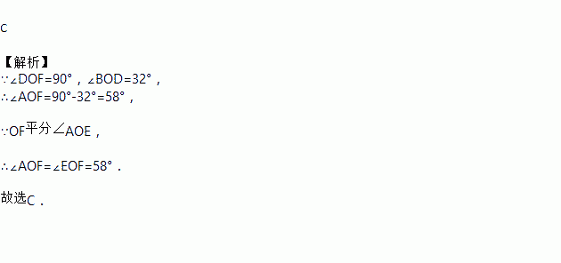 如图,直线AB、CD相交于点O,∠DOF=90°,OF平分∠AOE,若∠BOD=32°,则∠EOF的度数为( )