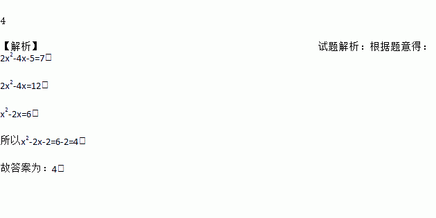 4 【解析】试题解析:根据题意得:2x2-4x-5=7, 2x2-4x=12, x2-2x=6, 所以x2-2x-2=6-2=4, 故答案为:4.