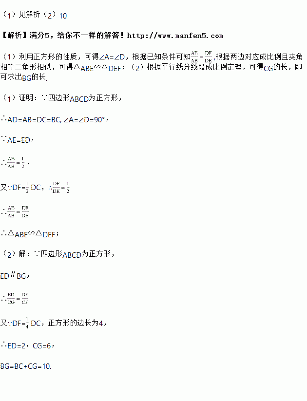 如图,在正方形ABCD中,E、F分别是边AD、CD上的点,AE=ED,DF=DC,连接EF并延长交BC的延长线于点G.