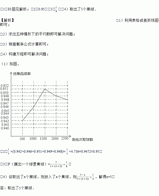 (3)从这批彩色弹力球中选择5个黄球、13个黑球、22个红球,它们除了颜色外都相同,将它们放入一个不透明的袋子中,求从袋子中摸出一个球是黄球的概率.