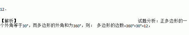 若一个正多边形的每一个外角都是30°,则这个正多边形的边数为_____.