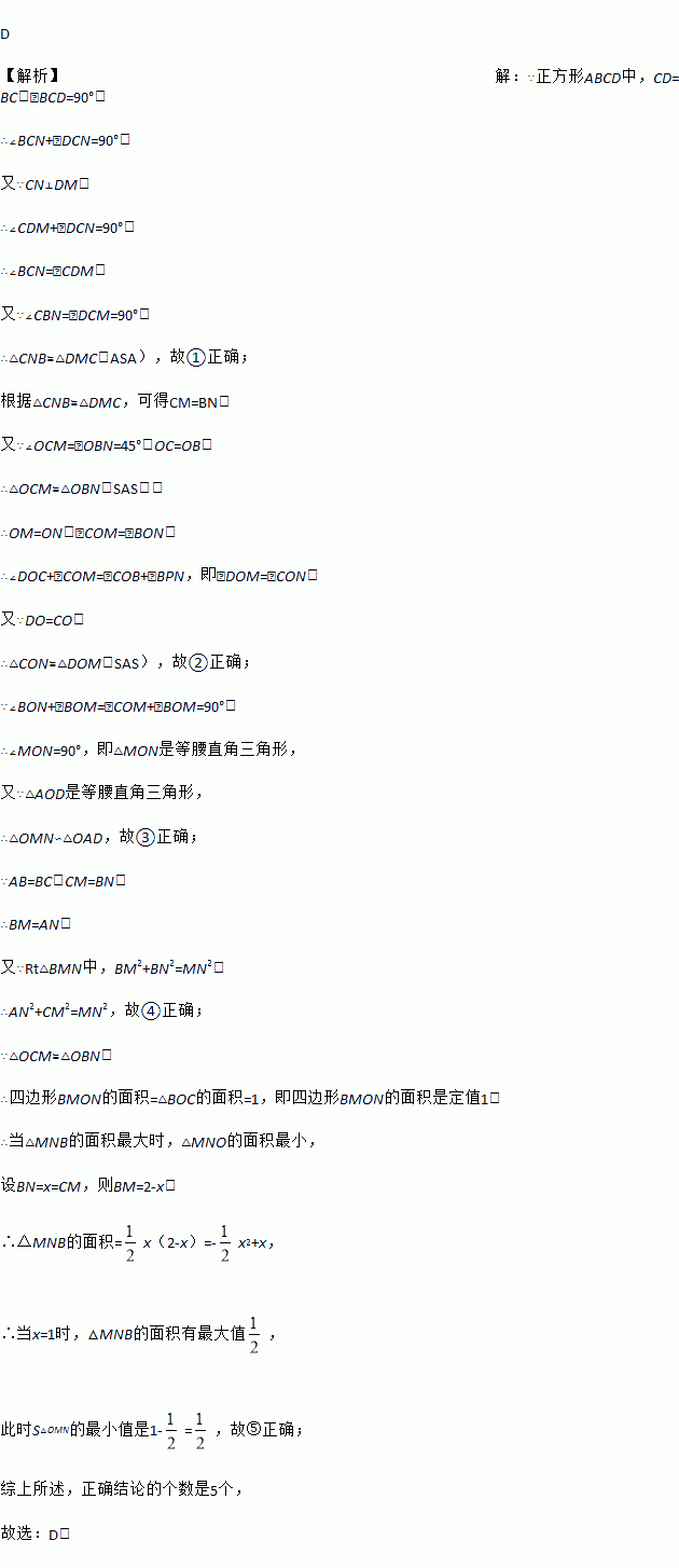 如图,在正方形ABCD 中,O是对角线AC与BD的交点,M是BC边上的动点(点M不与B,C重合),CN⊥DM,CN与AB交于点N ,连接OM,ON,MN .下列五个结论:①△CNB≌△DMC ;②△CON≌△DOM ;③△OMN≌△OAD ;④