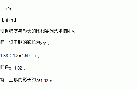 李栓身高1. 88 m ,王鹏身高1.60 m ,他们在同一时刻站在阳光下,李栓的影子长为1.20 m ,求王鹏的影长。