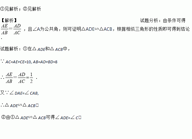 如图 , D 、 E分别为 AB 、 AC边上两点,且 AD=5, BD=3, AE=4, CE=6.试说明:①△ ADE∽△ ACB;②∠ ADE=∠ C.