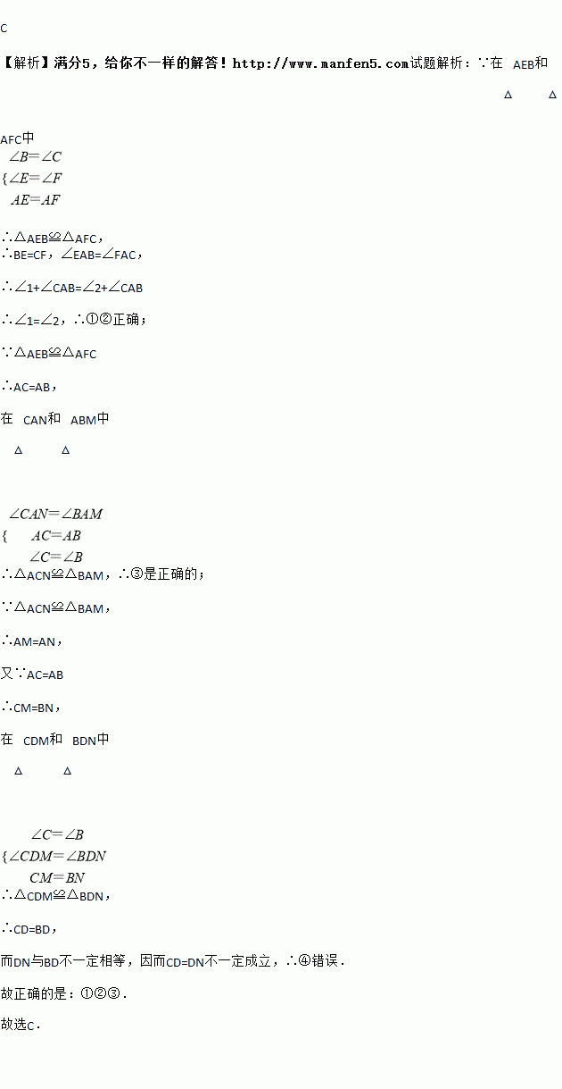 ①∠1=∠2;②BE=CF;③△CAN≌△ABM;④CD=DN其中正确的结论是( )