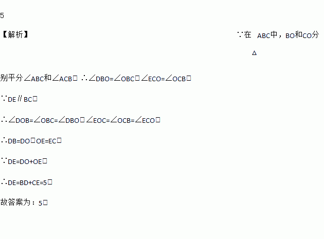 已知,如图,在△ABC中,BO和CO分别平分∠ABC和∠ACB,过O作DE∥BC,分别交AB、AC于点D、E,若BD+CE=5,则线段DE的长为________.