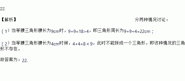 若等腰三角形的两边长分别为4 cm,9 cm,则等腰三角形的周长为____cm.