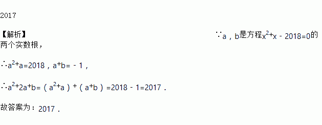 2017 【解析】∵a,b是方程x2+x﹣2018=0的两个实数根, ∴a2+a=2018,a+b=﹣1, ∴a2+2a+b=(a2+a)+(a+b)=2018﹣1=2017. 故答案为:2017.