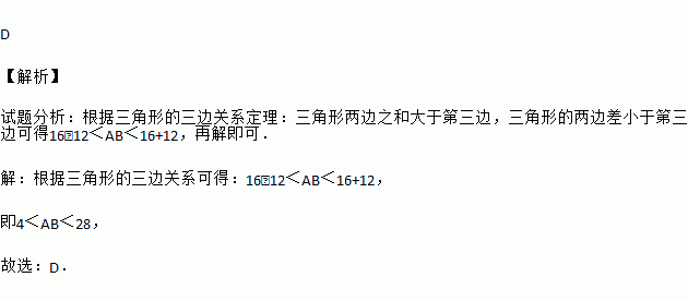 为估计池塘两岸A,B间的距离,杨阳在池塘一侧选取了一点P,测得PA=16m,PB=12m,那么AB间的距离不可能是( )