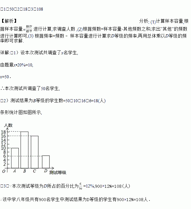 (3)若该中学八年级共有900名学生,请你估计八年级学生中体能测试结果为D等级的学生有多少人?