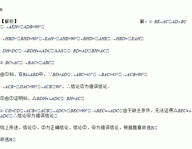 如图所示,H是△ABC的高AD,BE的交点,且DH=DC,则下列结论:①BD=AD;②BC=AC;③BH=AC;④CE=CD中正确的有( )