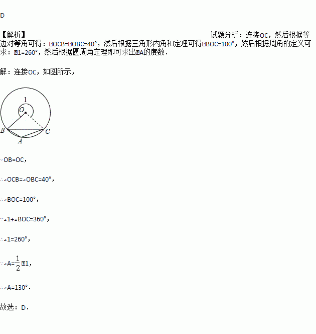 如图,△ABC内接于⊙O,∠OBC=40°,则∠A的度数为( )
