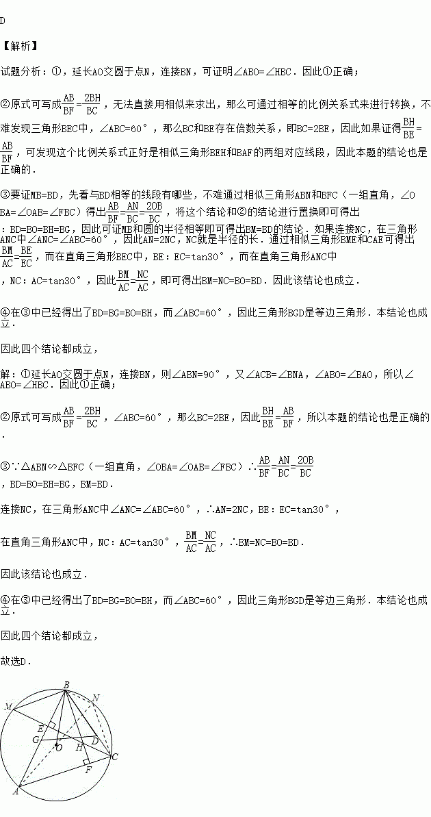 (2009•武汉模拟)如图,O是△ABC的外接圆的圆心,∠ABC=60°,BF,CE分别是AC,AB边上的高且交于点H,CE交⊙O于M,D,G分别在边BC,AB上,且BD=BH,BG=BO,下列结论:①∠ABO=∠HBC;②AB•BC=2BF•BH;③BM=BD;④△GBD为等边三角形,其中正确结论的序号是( )