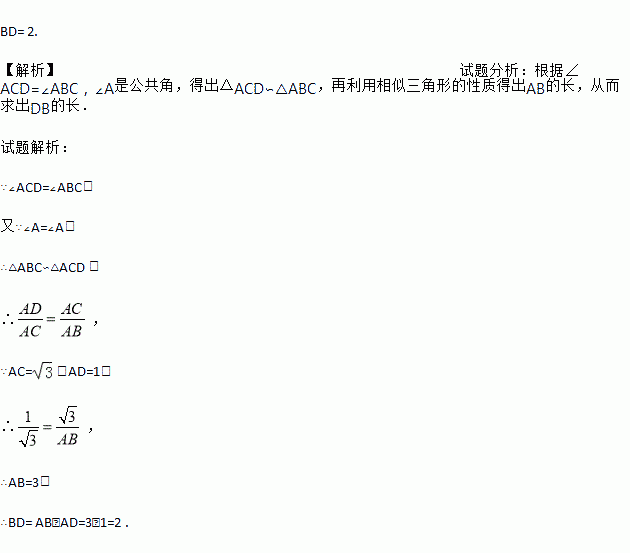如图,△ABC中,点D在边AB上,满足∠ACD=∠ABC,若AC=,AD=1,求DB的长.