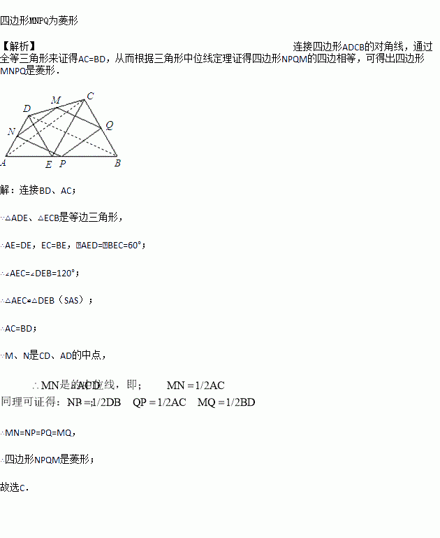 (8分)如图:在四边形ABCD中,E是AB上的一点,△ADE和△BCE都是等边三角形,点P、Q、M、N分别为AB、BC、CD、DA的中点,四边形MNPQ什么形状?说明理由。