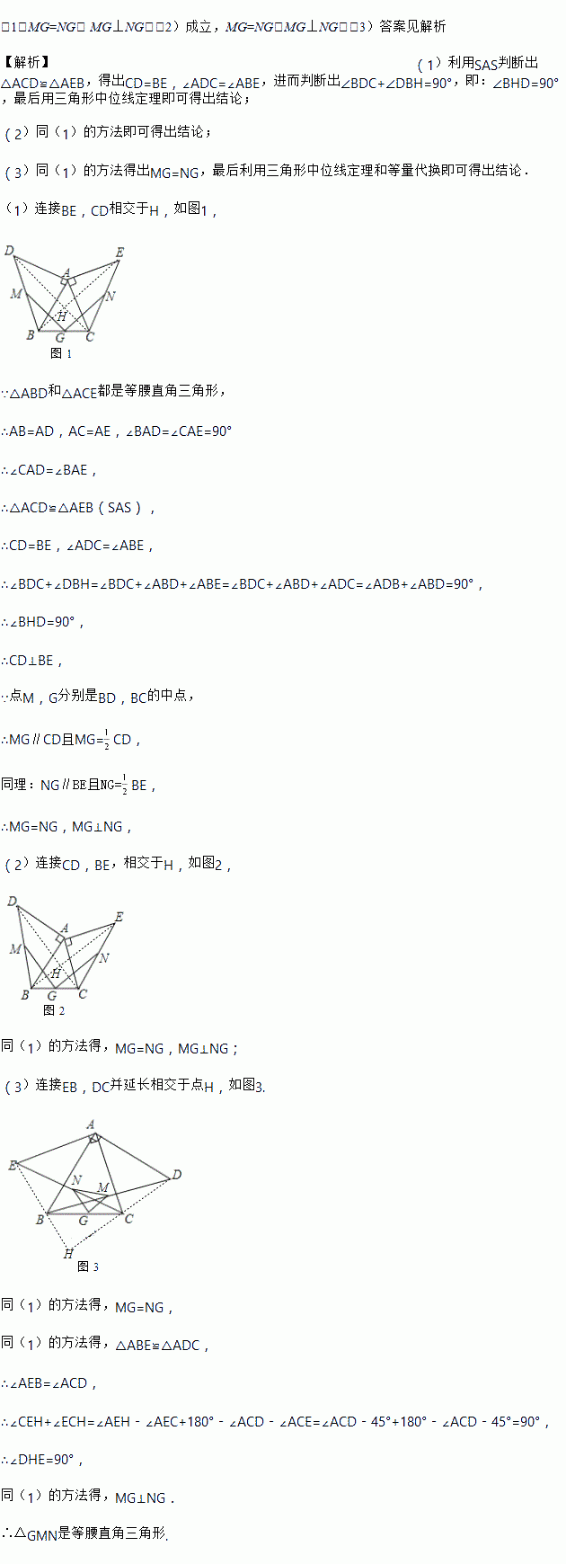 如图③,小明在(2)的基础上,又作了进一步的探究.向△ABC的内侧分别作等腰直角三角形ABD,ACE,其它条件不变,试判断△GMN的形状,并给与证明.