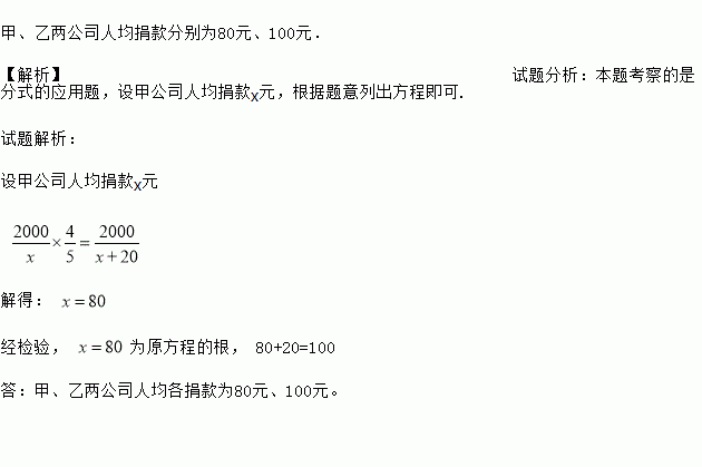 甲、乙两公司各为“希望工程”捐款2000元.已知乙公司比甲公司人均多捐20元,且乙公司的人数是甲公司人数的,问甲、乙两公司人均捐款各多少元?