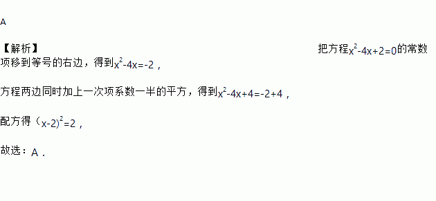 A 【解析】把方程x2-4x+2=0的常数项移到等号的右边,得到x2-4x=-2, 方程两边同时加上一次项系数一半的平方,得到x2-4x+4=-2+4, 配方得(x-2)2=2, 故选:A.