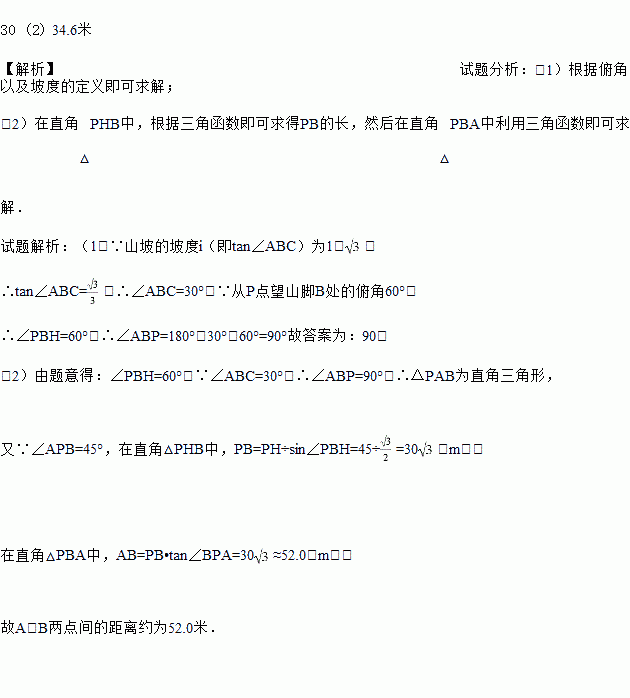 如图所示,小明在大楼30米高(即PH=30米)的窗口P处进行观测,测得山坡上A处的俯角为15°,山脚B处的俯角为60°,已知该山坡的坡度i(即tan∠ABC)为1: