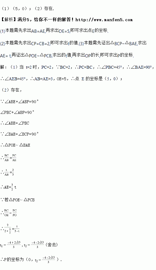 Èçͼ£¬ÒÑÖª¾ØÐÎ OABC£¬ÒÔµã O Îª×ø±êԵ㽨Á¢Æ½ÃæÖ±½Ç×ø±êϵ£¬ÆäÖÐ A£¨2£¬0£©£¬ C£¨0£¬3£©£¬µã P ÒÔÿÃë 1 ¸öµ¥Î»µÄËÙ¶È´Óµã C ³ö·¢ÔÚÉäÏß CO ÉÏÔ˶¯£¬Á¬½Ó BP£¬×÷ BE¡ÍPB ½» x ÖáÓÚµã E£¬Á¬½Ó PE ½» AB ÓÚµã F£¬ÉèÔ˶¯Ê±¼äΪ t Ã룮