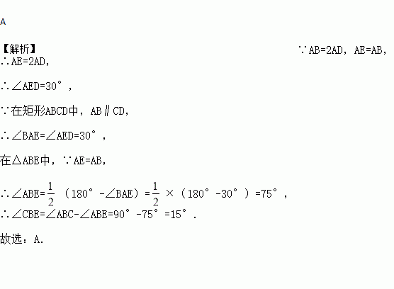 如图,在矩形ABCD中,AB=2AD,E是CD上一点,且AE=AB,则∠CBE等于( )
