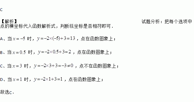 C 【解析】试题分析:把每个选项中点的横坐标代入函数解析式,判断纵坐标是否相符即可. A、当时,,点在函数图象上; B、当时,,点在函数图象上; C、当时,,点不在函数图象上; D、当时,,点在函数图象上; 故选C.