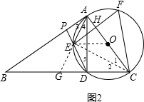 (3)如图(2)连接AD,若AE平分∠BAD,tan∠B=$\frac{3}{4}$,OH=$\frac{9}{2}$,射线DE交AB于点P,求AP的长.