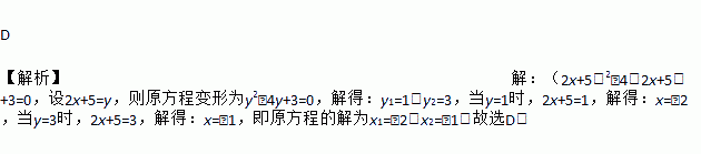 D 【解析】【解析】 (2x+5)2﹣4(2x+5)+3=0,设2x+5=y,则原方程变形为y2﹣4y+3=0,解得:y1=1,y2=3,当y=1时,2x+5=1,解得:x=﹣2,当y=3时,2x+5=3,解得:x=﹣1,即原方程的解为x1=﹣2,x2=﹣1,故选D.